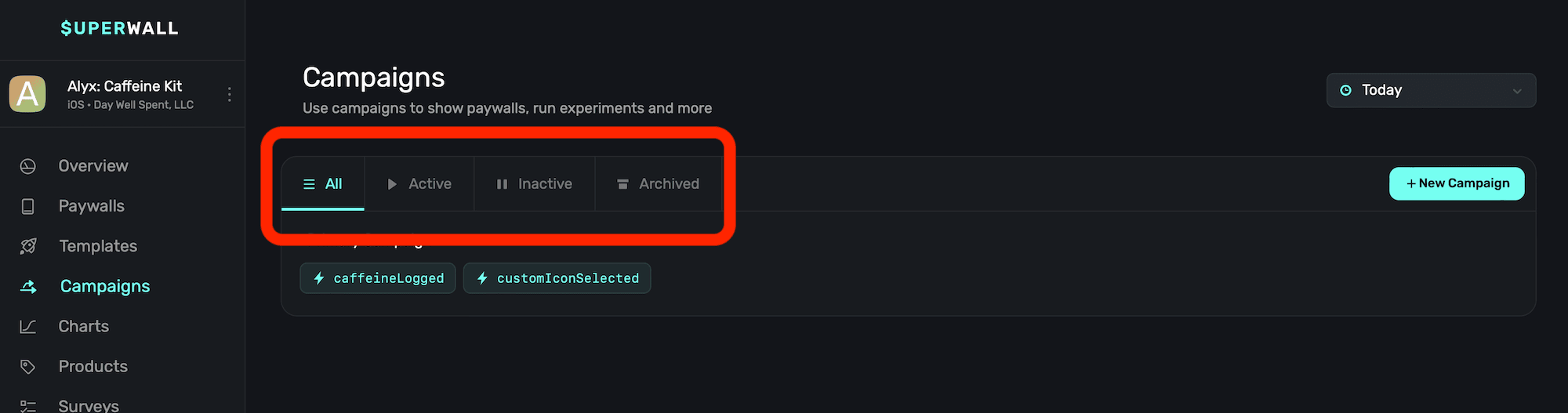 • Inactive: Campaigns that are not serving paywalls in production, but can be quickly re-enabled.