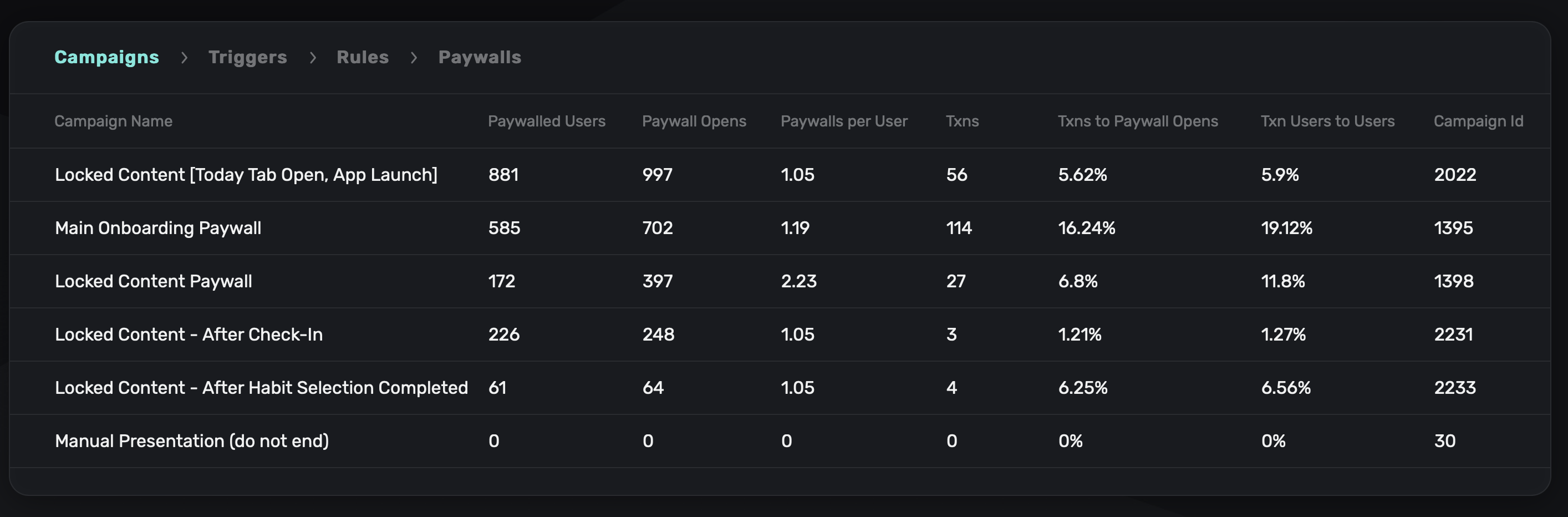 Below the high level metrics on the dashboard, you can see breakdowns per campaign/trigger/rule/paywall for the selected date range:
